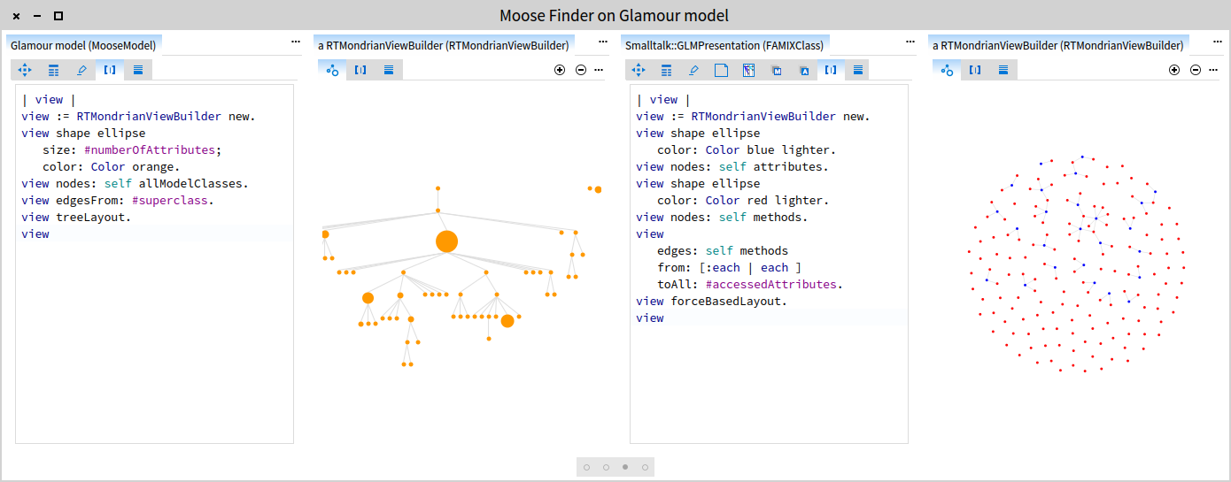 De exemplu, în poza de mai jos putem vedea o sesiune de analiză formată din patru pași. În primul panou se construiește o vizualizare a claselor, iar vizualizarea e arătată în al doilea panou; selectarea unei clase din această vizualizare duce la deschiderea unui nou panou cu detalii ale clasei. În acest al treilea panou, se mai poate construi o altă vizualizare care arată în partea dreaptă cum sunt utilizate atributele de către metodele clasei curente.