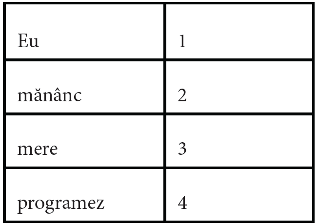 Utilizând cele două texte de mai sus, putem crea un dicționar comun atribuind indecși fiecărui cuvânt unic.