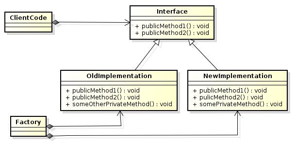Tehnica implică adăugarea unui nivel de abstractizare deasupra funcționalității la care se lucrează astfel încât codul client va comunica doar cu acest nivel de abstractizare, nefiind conștient dacă folosește versiunea originală sau nouă a implementării.