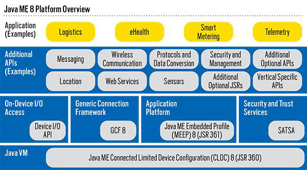 Platforma dedicată dispozitivelor cu cele mai puține resurse, cum ar fi cardurile, se numește sugestiv, Java Card. Totuși, primul produs din familia Oracle care aduce cu adevărat o contribuție importantă în spațiul IoT este Java ME Embedded 8. Prin urmare, în continuare ne vom concentra atenția asupra acestuia. Înainte de a ne uita la câteva detalii, trebuie să menționăm Java ME Embedded constă din două versiuni: Java ME Embedded și Java ME Embedded Client.