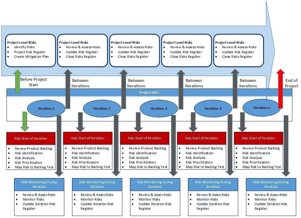 Este necesar să înțelegem, să identificăm, să monitorizăm și să reducem riscurile la cele două nivele. Managementul de risc la nivel de proiect ar oferi date de intrare pentru managementul de risc la nivel de iterație. Să luăm aminte că nu toate riscurile de la nivelul proiectului, sunt parte din riscurile la nivel de iterație. Unele riscuri pot fi diferite și altele pot fi unice doar la nivelul iterației. Monitorizarea riscurilor se face în timpul iterației, iar sesiunile de analiză a riscurilor ar trebui să aibă loc între iterații. Se recomandă ca situația riscurilor la nivel de iterație și de proiect să fie foarte bine cunoscută.