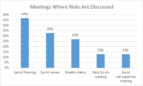 Respondenții au fost întrebați și care sunt atributele riscurilor pe care le documentează și le țin sub observație. Răspunsurile se pot vedea în graficul de mai jos. Respondenții au fost întrebați care din ceremoniile din Scrum este cea mai potrivită / folosită pentru a discuta riscurile cu echipa de development. Răspunsurile lor se pot vedea în graficul următor.