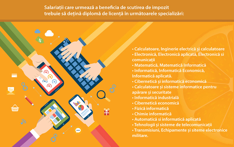 Din punct de vedere al salariatului, beneficierea de scutirea impozitului pe salariu este condiționată de a avea diplomă de licență în domeniul IT ( vezi imaginea de mai jos) și de ocuparea unor funcții în companie ca: analist, programator, proiectant de sisteme informatice, administrator baze de date, inginer software sau manager de proiect.