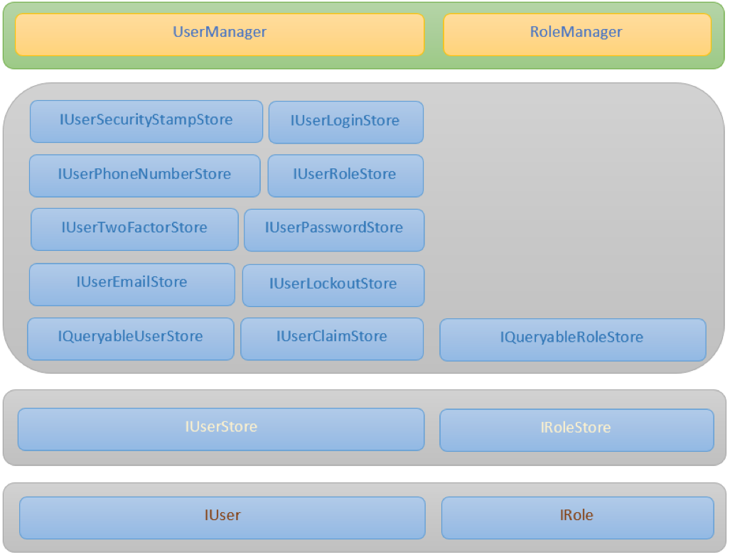 Dacă privim structura centrală, vom observa entitățile de bază, acestea fiind: IUser și IRole, care sunt folosite în partea de stores; IUserStore - user management și respectiv IRoleStore - pentru rol management.