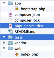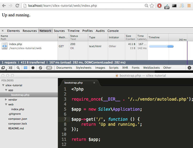 Fișierul de bootstrap defineste obiectul aplicației Silex și îl returnează. Conținutul fișierului accesibil public e foarte simplu, instanțiază acest obiect și îl rulează prin apelarea metodei run()