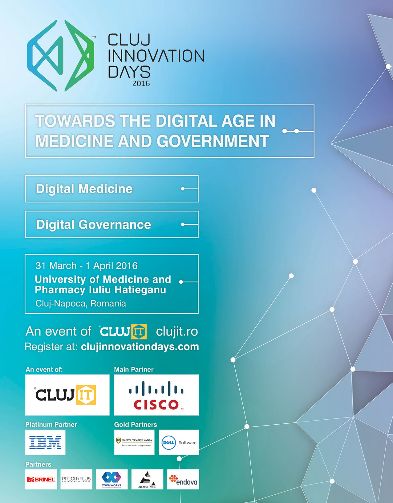 Medicina digitală și administrația digitală sunt cele două teme majore care vor fi dezbătute în cadrul Cluj Innovation Days 2016, eveniment ce se va desfășura în perioada 31 martie - 1 aprilie la Cluj-Napoca. Peste 400 de manageri din IT, medici, universitari, reprezentanți ai administrației publice și ai mediului de afaceri sunt așteptați la cea de-a patra ediție a forumului regional ce urmărește inovarea în IT. Printre invitații Cluj Innovation Days se numără specialiști români și străini, reprezentanți ai structurilor europene și americane, cadre universitare de la instituții de învățământ de prestigiu, oameni de afaceri și investitori.