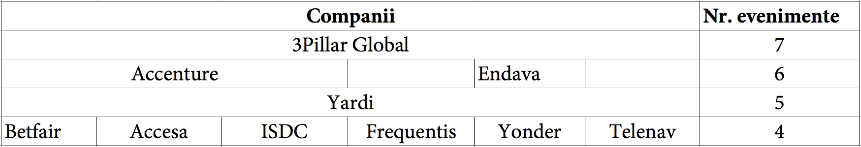 Așadar, în funcție de participarea la aceste evenimente în calitate de sponsor, 3Pillar Global conduce acest top urmat de Accenture și Endava.
