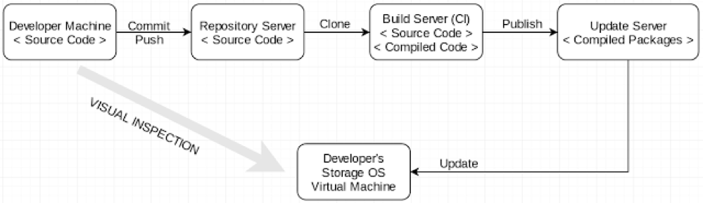 Când un programator schimbă codul, acest lucru e salvat pe server. Alt server verifică periodic codul sursă. Când detectează ceva schimbat, recompilează doar acea bucată sau acel modul. Apoi salvează rezultatul pe alt calculator, care, apoi publică acest update. Apoi alt calculator face un update astfel ȋncât programatorul să poată vedea rezultatul. Este uimitor cât de puţine lucruri s-au schimbat ȋn dezvoltarea de software, dar cât de multe alte lucruri din jurul programatorilor s-a schimbat. Nu mai avem tehnicieni care să transcrie codul de mână ... Acum putem folosi tastatura. Am eliminat tehnicianul care introducea cardurile ponsabile ȋn server. Acum transmitem totul ȋn reţea. Am eliminat personalul care mergea la client cu kit-ul de instalare ... Acum folosim Internetul. Am eliminat personalul de suport care instala software-ul ... Acum avem update-uri automate.