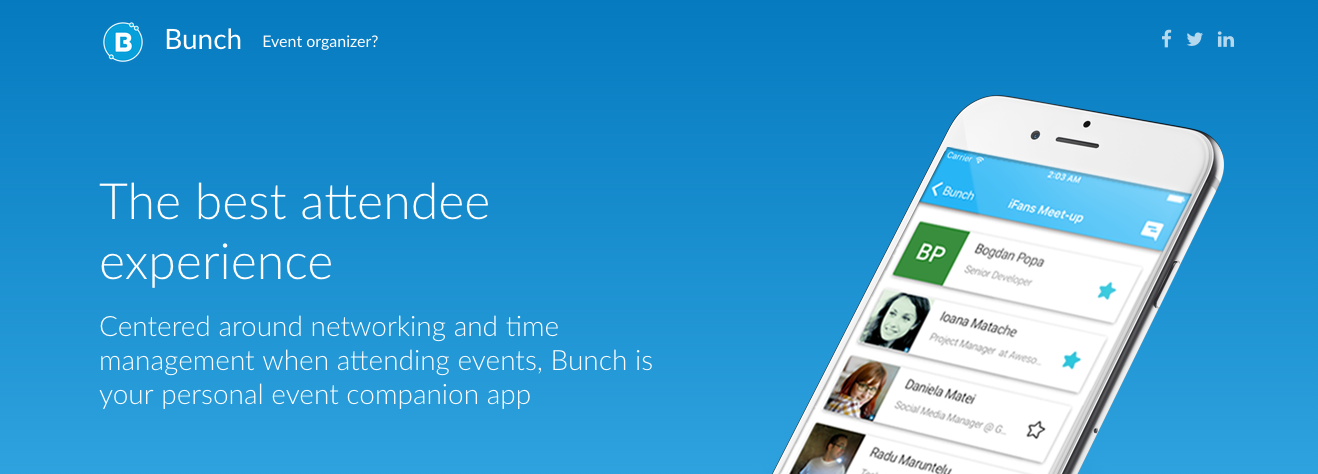 Bunch este o soluţie pentru participanţii la evenimente de business şi organizatorii acestora. Aplicaţia este construită cu acceent pe nevoile de networking ale utilizatorului final şi are ca scop îmbunătăţirea experienţei sale la evenimente şi cunoaşterea unor alţi participanți cât mai relevanţi.