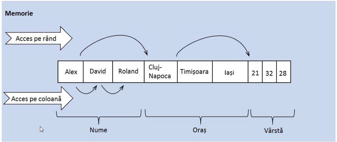 Conținutul coloanelor unei tabele sunt salvate “una lângă alta” în memorie. Asta înseamna ca operațiile pe coloane ( SUM, AVG ) sunt executate mai rapid. Cu acest mod de stocare accesul la tot rândul este dezavantajat.