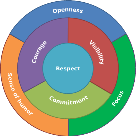 Să începem prin a ne reaminti care sunt aceste valori pe care Scrum se sprijină: Respect, Curaj, Concentrare, Angajament și Deschidere. La aceste cinci valori s-au adăugat apoi prin sugestiile comunității practicienilor încă două, pe care le consider la fel de importante: Vizibilitate și Simțul Umorului. Luate fiecare în parte, toate cele șapte valori par a fi lesne de înțeles. Care sunt însă relațiile dintre ele? De ce au fost alese aceste valori și nu altele pentru a practica Scrum? Să încercăm să descifrăm împreună sensurile lor mai profunde.