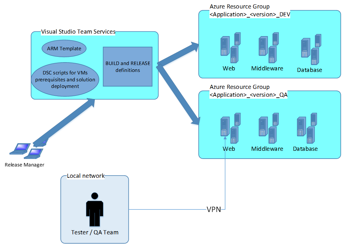 Evident, tester-ii lucrează de la birou, iar soluția a fost instalată în Microsoft Azure. Este nevoie ca tester-ii să poată accesa în mod securizat diversele componente ale soluției supuse testării. O opțiune simplă este realizarea unei conexiuni de tip Site to Site între rețeaua locală de la birou si VNET-ul din Azure, tester-ii văzând soluția la IP-uri locale (ca în figura de mai sus), precondiția fiind că toate RG-urile (mediile) din Azure sunt parte ale aceluiași VNET. Schematic, lucrurile arată așa: