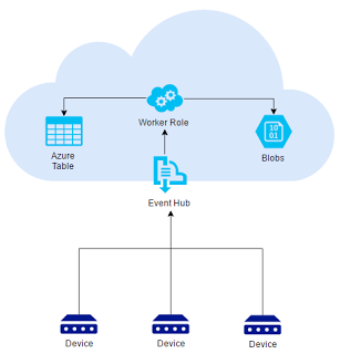 Soluţia pentru această situaţie este de a avea un sistem de mesaje, bazat pe evenimente, care reunește toate impulsurile de locaţie de pe dispozitive. Pe Azure, putem folosi Azure Event Hub, care poate accepta volume mari de date.