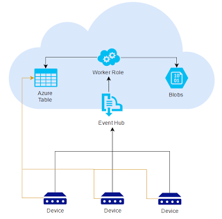 Fiecare dispozitiv interoghează Azure Table pentru a actualiza ultima locaţie cunoscută. O altă interogare este trimisă către Azure Event Hub pentru a împinge impulsul de locaţie la audit. Pe partea de backend, elementele ce trebuie încărcate descresc drastic. Avem nevoie doar de instanţe de Worker Roles care creează datele de audit. În Azure Tables vom avea ultima locaţie a fiecărui dispozitiv disponibil pentru raportare sau alte tipuri de acţiuni.