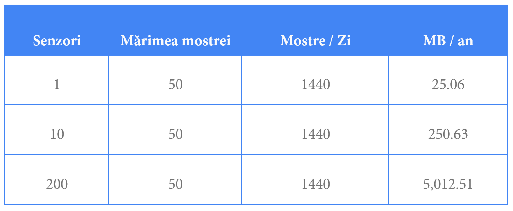 Rezultatele au arătat că Raspberry Pi poate manipula până la 10 fire de execuție (ceea ce presupune senzori) cu o încărcare decentă. Dacă mergem dincolo de 10 senzori, sistemul se va supraîncărca și nu va putea fi utilizat deoarece va fi afectată grav experiența de lucru a utilizatorului. În ceea ce privește dimensiunea datelor stocate, după ce am adăugat date suficiente pentru a putea face estimări, concluzia a fost că dimensiunea datelor pentru studiul de caz al afacerilor mici este de 5GB/an, ceea ce poate încăpea pe un hard disk sau stick de memorie. Stocarea pe flash drives ar putea să fie o problemă datorată numărului limitat de editări. Mai jos puteți consulta mărimea necesară pentru stocare: