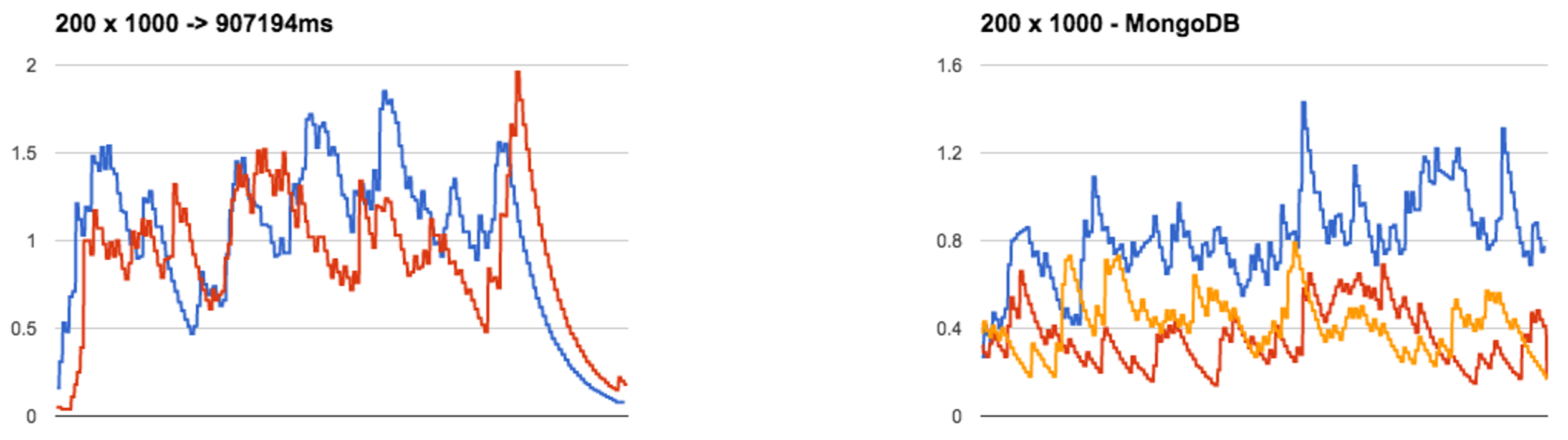 Rezultatele au fost destul de impresionante atât pentru nodurile Spring Boot cât și pentru nodurile MongoDB. În cadrul graficelor de mai jos se poate observa că gradul de încărcare este sub 2 pe toate sistemele. Pe graficul MongoDB linia albastră reprezintă gradul de încărcare a nodului principal al setului de replicare.