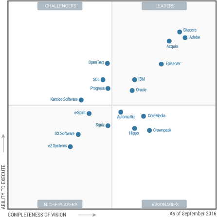 Iată o soluţie pentru construirea aplicaţiilor robuste de nivel enterprise. Sitecore este în esență o soluţie CMS construită pentru administrarea conţinutului global şi în mai multe versiuni de limbă, fiind însă suficient de flexibil pentru a fi adaptat cerinţelor în continuă schimbare ale mediului enterprise. Valoarea acestui produs este recunoscută și prin poziționarea sa în zona de leader a cadranului magic Gartner pe 2016 în materie de Web Content Management, având cel mai mare scor la capacitatea de execuţie. Este un fapt cunoscut că Gartner nu susţine niciun furnizor, produs sau serviciu incluse în acest studiu şi publică rezultatele doar pe baza cercetărilor anterioare (cercetarea şi metodologia de ierarhizare sunt toate descrise în articolul publicat). Prin urmare, Sitecore se poziţionează excelent ca una dintre cele mai bune soluţii de management de conţinut actuale. Raportul Gartner nu trebuie luat drept broșură de recomandări, ci mai degrabă ca oferind o perspecitvă globală asupra universului CMS enterprise. Acest lucru este important deoarece nu veţi alege doar o platformă de management de conţinut, ci un partener pentru viitor. Vă datoraţi vouă şi clienţilor voştri să planificaţi atent şi să luaţi decizii bune încă de la început.