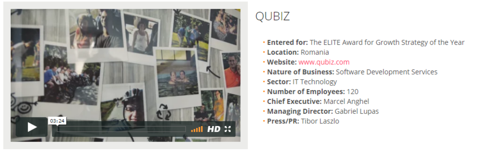 Reușita nu a trecut neobservată. În septembrie 2016, am fost nominalizați la European Business Awards, cea mai mare competiție de business din Europa. La această ediție a concursului au participat 34000 de companii, dintre care 648, printre care și Qubiz, au mers mai departe.