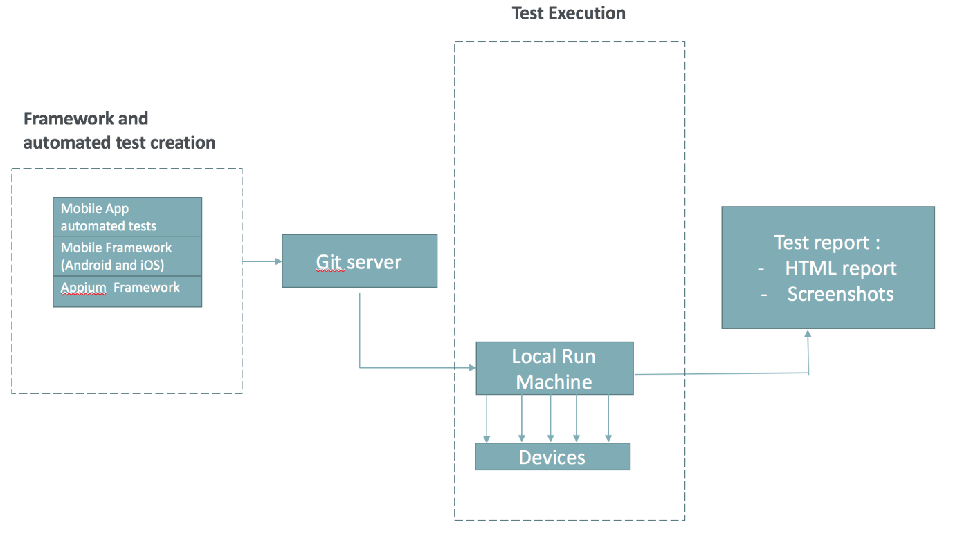 Pentru început, am pornit cu construcția unui framework generic, cu care să testăm local aplicații iOS și Android. Am creat un framework generic, folosind JAVA și TestNG, pe care l-am folosit pe câteva proiecte pentru testarea mobilă local (mașina pe care se scriu testele este și mașina care le execută).