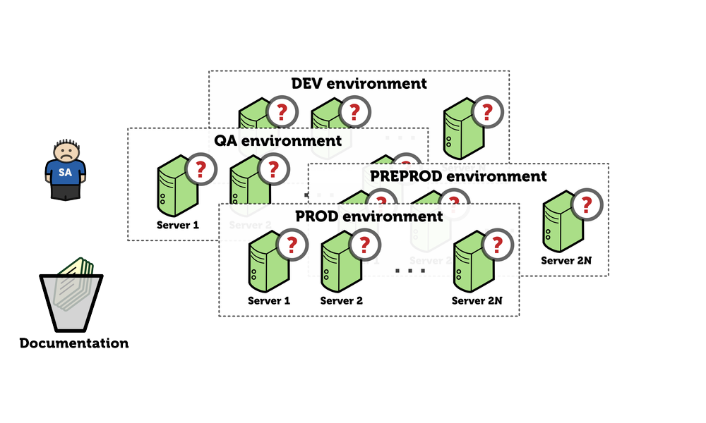 Lucrurile se înrăutățesc în timp. Din ce în ce mai multe solicitări de modificare intră în sistem. Constatând că procesul de modificare a infrastructurii este lent, dezvoltatorii încep să efectueze personal unele modificări pentru a accelera lucrurile.