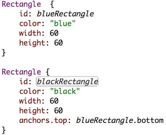 Obiectul creat se poate recunoaște prin id. Id-ul este o proprietate esențială atunci când dorim să accesăm obiectul nostru și să îi setăm proprietățile din exterior sau când vrem să conectăm o proprietate a unui obiect de o proprietate a altui obiect. QML impresionează prin ușurința de a crea componente conectate între ele printr-un limbaj implicit și foarte expresiv (spre deosebire de alte limbaje mult mai explicite).