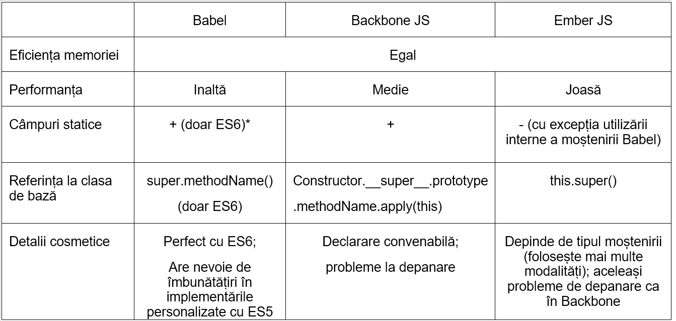 - utilizarea Babel este perfectă când se combină cu ES6; la scrierea unei implementări personalizate pentru ES5 pornind de la aceasta, câmpurile statice și referința la clasa de bază ar trebui implementată manual.