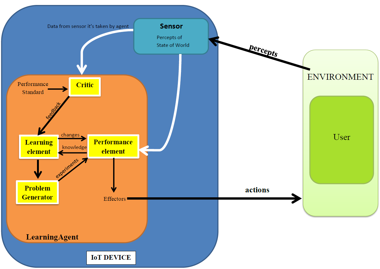 În diagrama de mai jos este definit modul în care trebuie să arate un sistem IoT cu un agent inteligent de învăţare integrat şi funcționalitatea acestuia cu privire la metoda de învăţare şi acumulare de noi cunoştinţe.