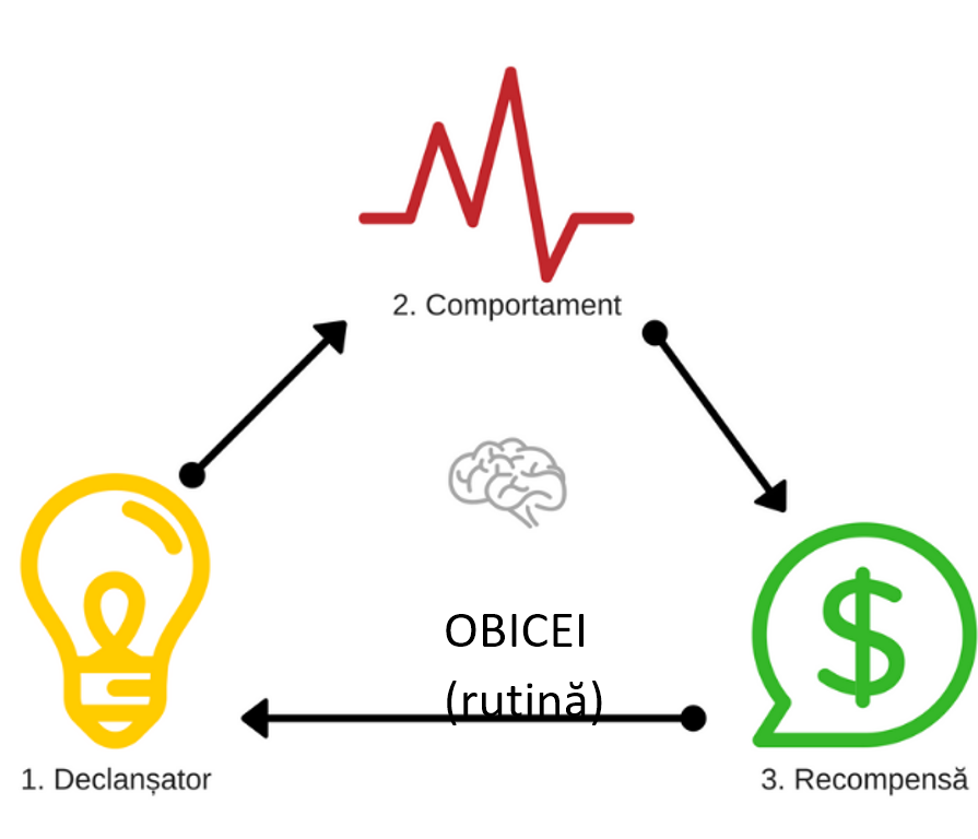Obiceiul este acel comportament asociat unui anumit context/stimul declanșator (social, psihologic, vizual, auditiv etc.), a cărui acțiune are ca urmări diferite recompense pentru creier. Iar pentru a clarifica și mai mult acest aspect, aparent abstract, vom introduce Fig. 1 de mai jos împreună cu un exemplu concret: