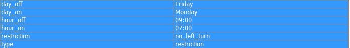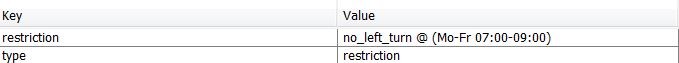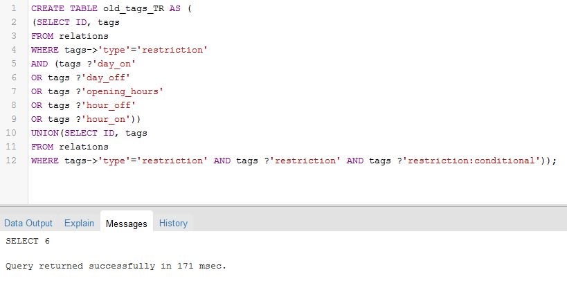 Există taguri mai vechi în OpenStreetMap care trebuie aduse la zi după noua schemă pentru a putea fi procesate de aplicația de rutare. Să luăm spre exemplu restricțiile condiționale. O restricție condițională se prezintă printr-o structură diferită față de cea a unei restricții obișnuite, fiind definit un interval orar, săptămânal sau lunar în timpul căruia se interzice o anumită manevră. Query-ul de mai jos a fost conceput pentru a selecta toate way-urile cu restricție condițională care au fost adăugate după formatul vechi (Fig.5). După crearea tabelului, urmează extragerea lor din baza de date și în final editarea efectivă în JOSM pentru corectarea lor (Fig.6).