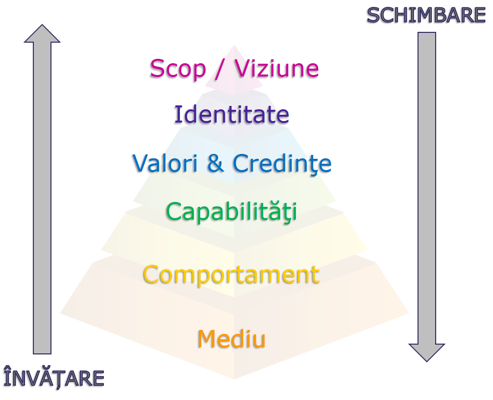 Este foarte interesantă însă succesiunea ciclurilor de învățare-schimbare modelată de piramida lui Dilts: prin învățare putem ajunge la modificări relevante la nivelul credințelor, identității sau chiar viziunii, care apoi să influențeze alte abilități, comportamente care apoi să conducă la un nou nivel al evoluției.
