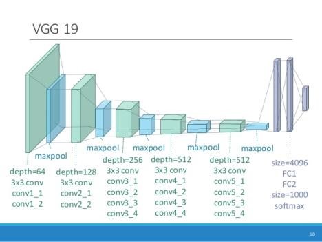 Figura 3: Reprezintă arhitectura rețelei VGG19 cu straturile de convoluție urmate de operația de max pooling, în final având 3 straturi în tonalitate conectate, dintre care unul e strat decizional.