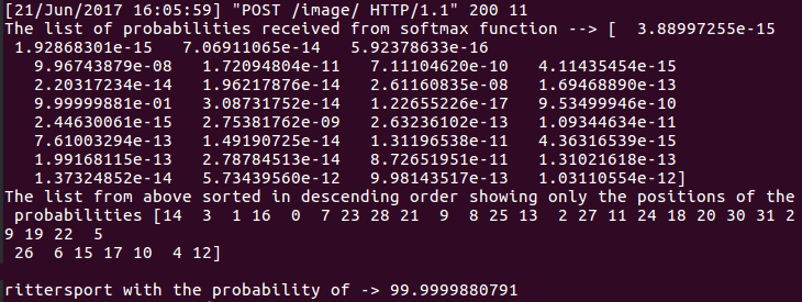 Mai jos în Figura 4, am inserat rezultatele oferite în urma evaluării imaginii din partea dreaptă. Rezultatele prezintă o listă de probabilități ordonate descrescător, ultimul element având cea mai mare probabilitate, poziția lui în final determină și clasa din care face parte imaginea. Imaginea dată ca input a fost recunoscută cu o probabilitate de 99.9%.