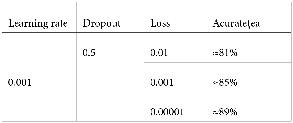 Antrenarea folosește batches a câte 10 imagini, rata de învățare de 0.001, iar pentru a diminua overfittingul, algoritmul folosește un dropout cu valoarea de 0.5. Am decis ca la anumite valori ale lossului acuratețea algoritmului să fie verificată, iar în tabelul de mai jos sunt menționate valorile obținute. Pentru un loss în valoare de 0.01 am obținut un procent de acuratețe de ≈81%. După ce am lăsat algoritmul să conveargă, acuratețea a crescut la 91.2%.