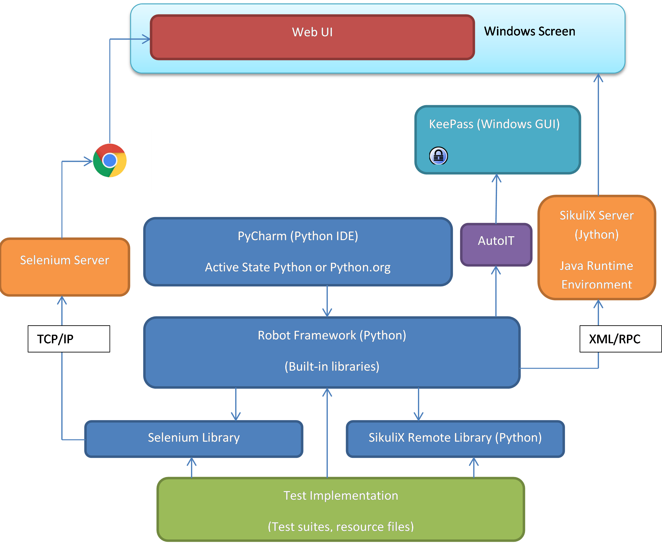 Deși există biblioteci open source disponibile în Robot Framework pentru fiecare dintre componentele SikuliX, Selenium și AutoIT, doar biblioteca Selenium este destul de avansată și folosită pe larg, astfel încât ne putem baza pe ea. Scriptul AutoIT este apelat ca proces separat din Robot Framework, deși poate fi implementată și o bibliotecă Robot Framework dacă se consideră necesar. Pentru SikuliX este recomandată implementarea unei biblioteci noi, mai degrabă decât rularea ca proces separat ale unor scripturi exclusive SikuliX. Implementarea acestor biblioteci în Robot Framework permite executarea combinată, în funcție de nevoi, a oricărei acțiuni prin intermediul celor 3 componente. De exemplu, verificarea și clickul pe un element identificat cu Selenium, apoi verificarea și clickul pe un element identificat cu SikuliX și eventual extragerea informațiilor din baza de date, de exemplu pentru login, cu ajutorul AutoIT.