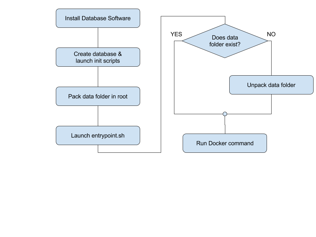 Reţeta de bază va instala software-ul și orice alte utilităţi necesare, apoi aceasta va "urca" volumul de date și va lansa scriptul init (scriptul de iniţializare). Scriptul init va verifica dacă dosarul de date este gol sau nu, iar, în funcţie de starea de fapt, va lansa iniţializarea scripturilor din dosarul docker-entrypoint-initdb.d care au fost urcate/încărcate de utilizator.