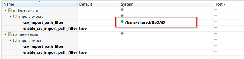 ALTER SYSTEM ALTER CONFIGURATION ('indexserver.ini', 'system') set ('import_export', 'csv_import_path_filter') = '/ A; / B'with reconfigure
