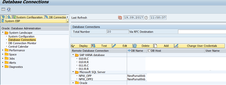 Figura 5: Conexiunile la diferitele baze de date, configurate în DBACOCKPIT