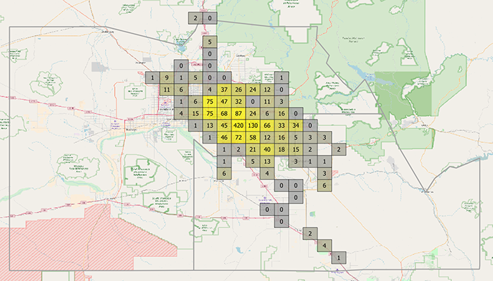 În harta de mai jos sunt reprezentate prin metoda heatmap toate restricțiile editate de echipa Telenav, din noiembrie 2017 și până în prezent, în Phoenix. Culorile mai închise reprezintă o densitate mai mare a editărilor, iar culorile mai deschise o densitate mai mică.
