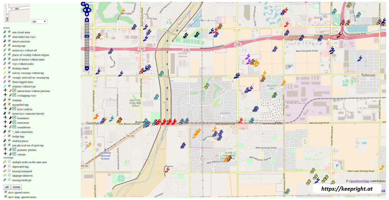 De asemenea, o bază de date utilă ce reprezintă erori din OSM se poate accesa pe site-urile http://osmose.openstreetmap.fr/en/map/ și https://keepright.at/.