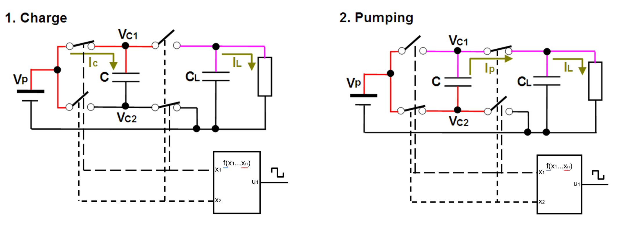 O implementare generală a unei pompe de încărcare este prezentată în figura de mai jos cu mențiunea că circuitul electric prezentat doar dublează tensiunea de la intrare. Contactele care duc la buna funcționare a unui astfel de circuit comută cu o frecvență fixă generată de un circuit de oscilație intern. În cazul memoriilor flash Freescale în tehnologie C55, această frecvență este egală cu 64MHz.