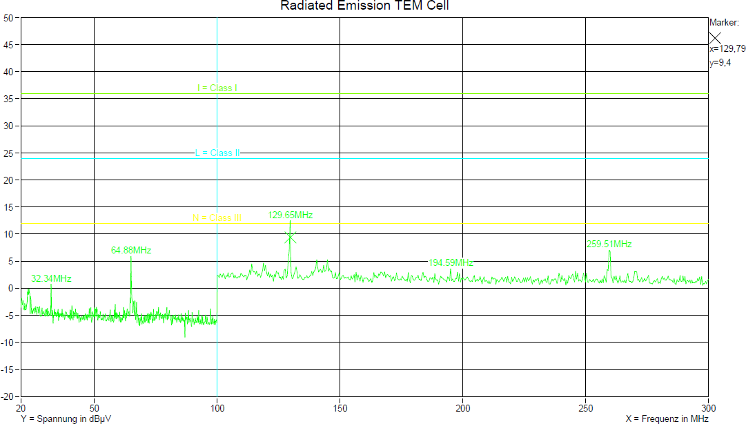 În următoarea figură poate fi vizualizat spectrul EMI al unui dispozitiv care are implementat mecanismul de emulare al EEPROM-ului. Pot fi observate componentele spectrale generate de emularea EEPROM. Frecvența de funcționare a pompei de încărcare este 64.88MHz și poate fi observată în partea stângă a spectrului. În cadrul măsurătorii a fost observată și prezența armonicilor acestei frecvențe. Cea mai mare amplitudine este cea a armonicii de ordinul doi.