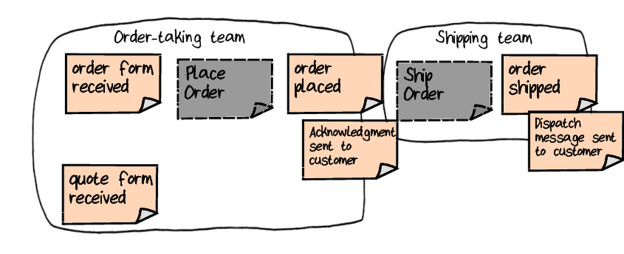 Începem prin a pune pe o tablă note cu acțiunile posibile, le grupăm pe domenii și adăugăm evenimentele de legătură între ele. În cazul de mai sus, order place și ack. sent to customer reprezintă acțiunile de legătură între un sistem de primire a comenzilor și sistemul de livrare.