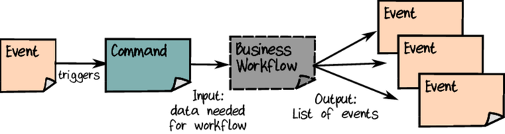 Se poate observa cum un eveniment va lansa o comandă și care la rândul său poate lansa mai multe evenimente pentru a fi finalizată.