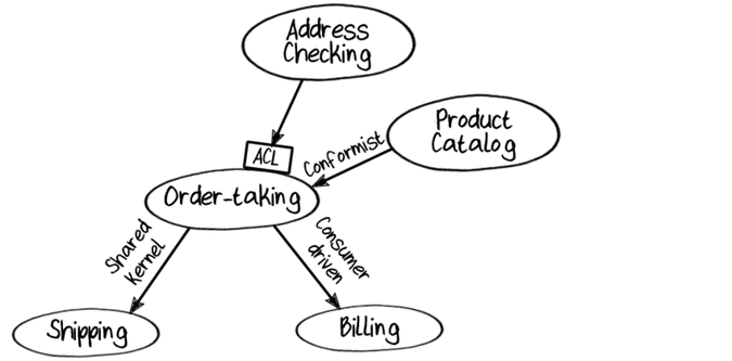 Shared Kernel - ambele domenii folosesc împreună un model comun. Echipele trebuie să fie de acord cu acesta, iar orice schimbare trebuie realizată de comun acord. Această abordare este în general dificil de realizat și de menținut.