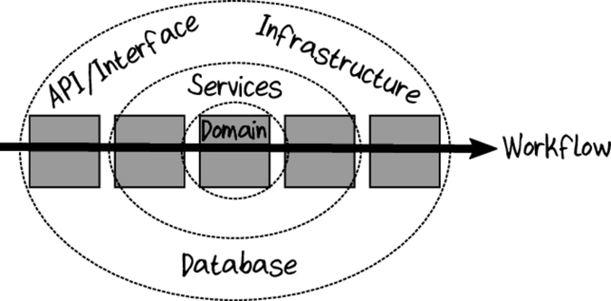 Merită menționată și arhitectura de tip Usturoi (Onion Architecture) folosită în programarea funcțională. Dacă în abordarea OOP, modelele și accesul la baza de date se realizează în interiorul domeniului, într-o abordare funcțională, acestea sunt poziționate la extremități astfel încât toate dependințele sunt pe intrarea / ieșirea din componentă. O funcție care scrie și citește dintr-o bază de date va fi considerată impură, iar folosirea acestora va fi evitată în partea de core a domeniului :