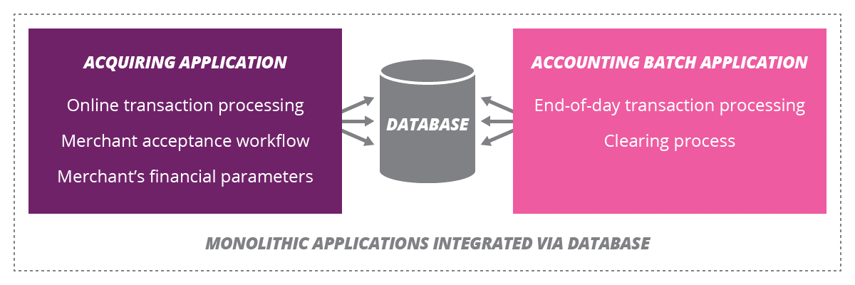 O abordare monolit este una în care baza de date este comună. Pe de o parte, se procesează datele clienților online, pe de altă parte, la finalul zilei, pe aceeași bază de date se procesează rapoartele și se optimizează datele acumulate în timpul zilei. Un exemplu în acest sens este clasicul ETL (extract/transform/load).