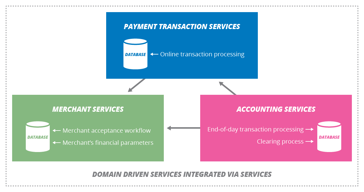 Următorul pas este să aplicăm DDD, să definim limitele domeniilor și să modelăm arhitectura în felul următor:
