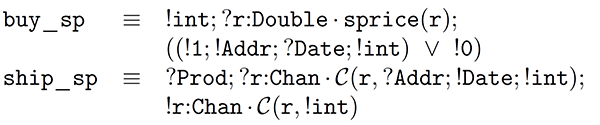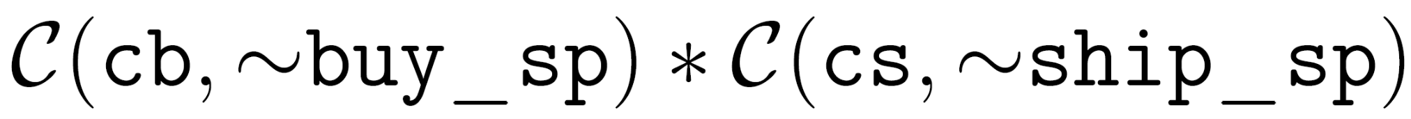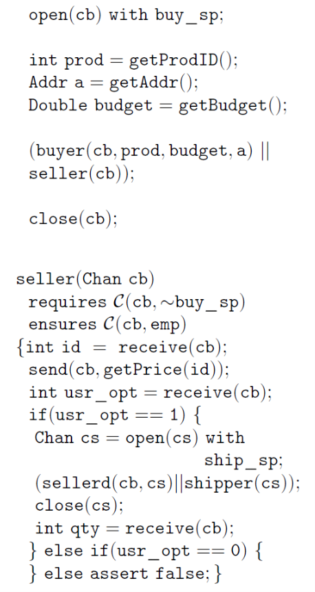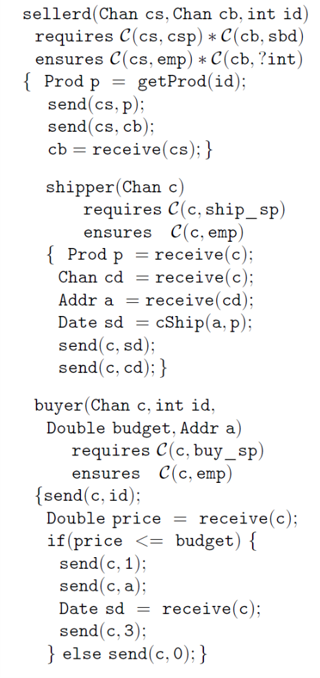 , unde ~buy_sp și ~ship_sp sunt calculate utilizând reguli duale. Apoi, după executarea simbolică a liniei 1, starea simbolică a programului reflectă primirea unei valori int prin canalul cb înlăturând ?int din specificația lui cb. Formal, dacă precondiția lui receive rămâne validă, următoarea stare simbolică include cadrul rezultat după oferirea precondiției alături de postcondiția metodei. Același raționament se aplică liniilor 2-3 și 5-7, cu observația că linia 3 reprezintă o alegere/opțiune în specificația lui cb: ((?1; :::) V ?0), în timp ce linia 22 denotă o delegare. Este important de remarcat că abordarea noastră este compozițională, e.g. verificarea metodei send respectă aceeași regulă indiferent dacă este folosită pentru delegare sau doar pentru trimiterea unei valori int pe un canal specific.