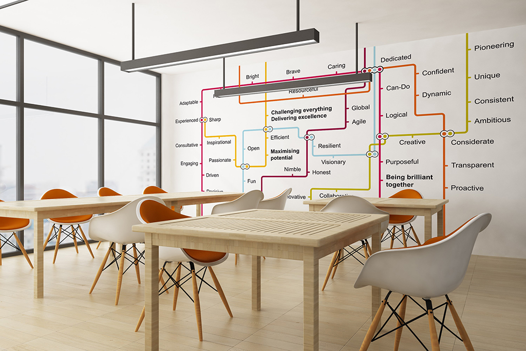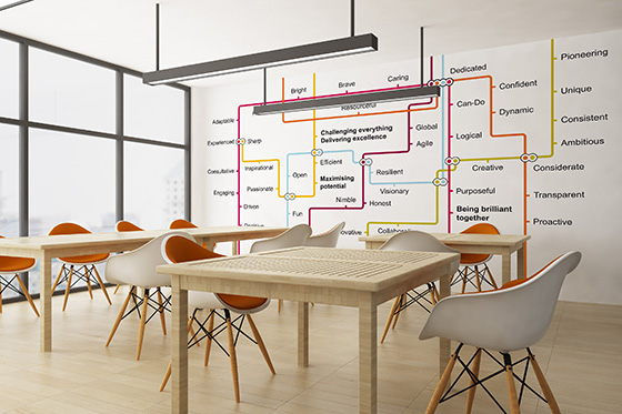 La nivel intern, pentru noile lor birouri, ne-am inspirat din culorile şi valorile expuse în manualul lor de brand pentru a da culoare spaţiului, în adevăratul sens al cuvântului. Fiecare element a fost creat cu grijă pentru a se integra în poveste.