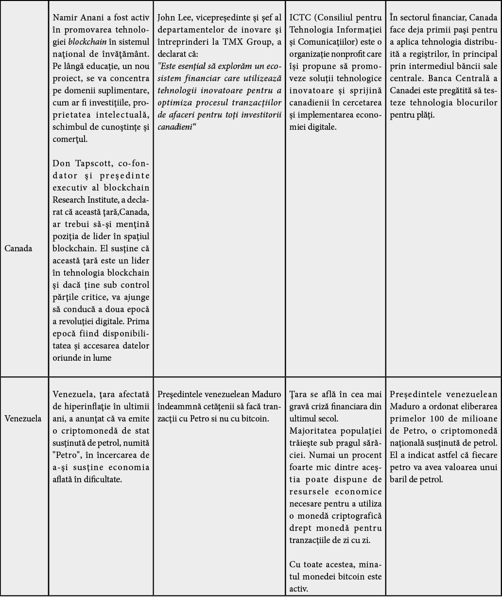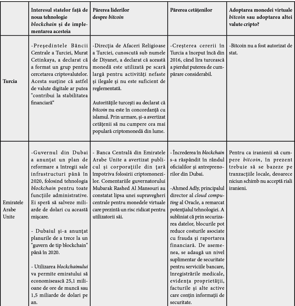 Referitor la obiectivul specific conform căruia tehnologia blockchain ar trebui folosită în eficientizarea altor sisteme de activitate, acesta a fost îndeplinit. Statele analizate au un interes ridicat faţă de noua tehnologie şi mai mult de cât atât, o şi implementează. Drept urmare, atât populaţia statelor cât şi liderii politici sunt interesaţi de implementarea tehnologiei blockchain şi în alte domenii de activitate pentru a îmbunătăţi şi eficientiza sistemele de operare, pentru a simplifica tranzacţii şi cel mai important pentru a câştiga timp în rezolvarea atribuţiilor zilnice.